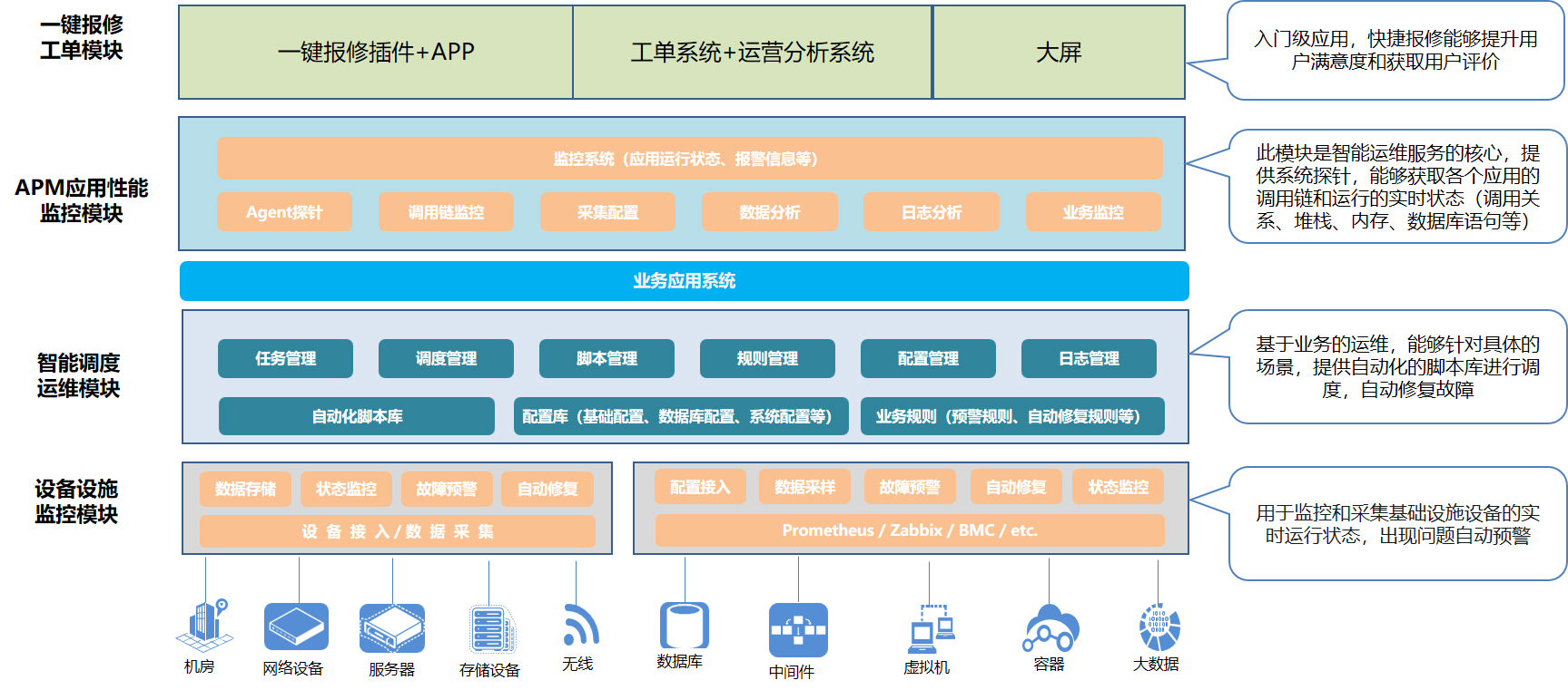 通過構建覆蓋IaaS、Paas、SaaS的智能運維平台,為(wei) 企業(ye) 提供智能化的監控、預警、問題根因定位等服務;平台由四大模塊構成:一鍵報修工單模塊、APM應用性能監控模塊、智能調度業(ye) 務運維係統、設備設施監控係統,各模塊可自由選配和組合,為(wei) 用戶提供靈活的解決(jue) 方案。